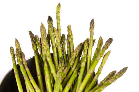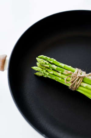 Ripe Asparagus in a pan ready to be cooked on a white background