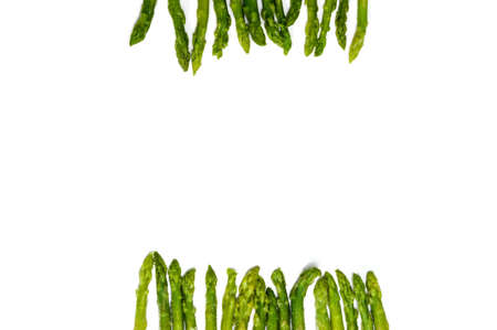 Fresh green asparagus shoots pattern, top view. Isolated over white. Food background asparagus flat lay pattern