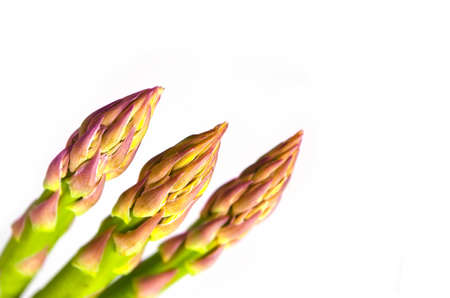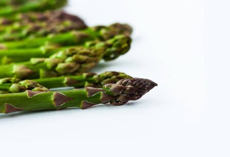 Fresh green asparagus sprout tops, closeup. A bunch of three asparagus stems, isolated on white background, macro.