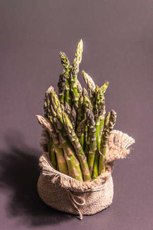 A bunch of ripe asparagus in a burlap napkin. Fresh ingredient for healthy food, black stone cooking background, copy space