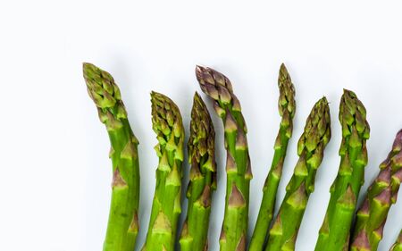 Bunch of fresh raw asparagus on white background, vegetarian concept. Green grass sparrowgrass sticks, food for veggie