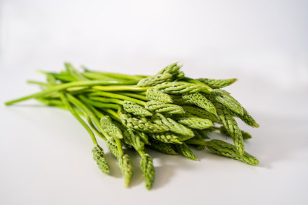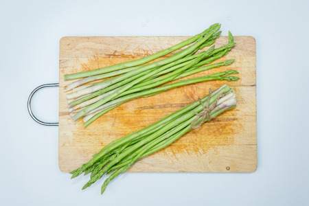 Fresh wild asparagus, on a white background ready to be cooked. copy space for text