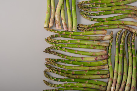 Green asparagus pattern on background. Vegetable sprouts stems. Fresh food top view.