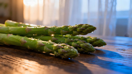 A close-up shot of vibrant green asparagus spears with water droplets, set against a dark, textured background.