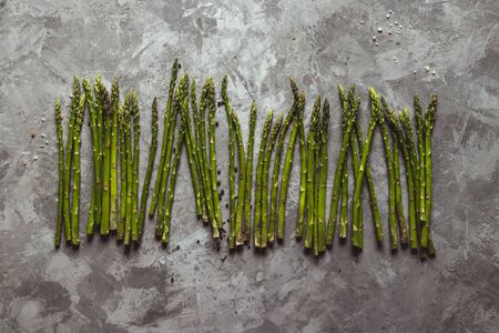 Fresh bunch of asparagus with smooth daylight on grey stone background/top view
