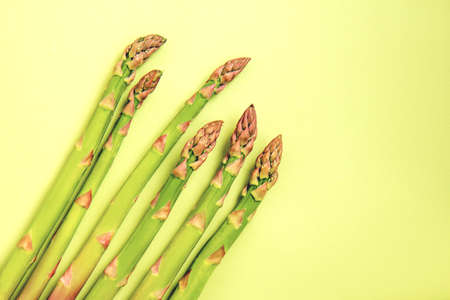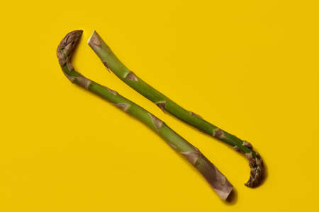 Two ripe green asparagus stems against yellow background. Healthy nutrition, food and seasonal vegetables harvest. Close up, copy space