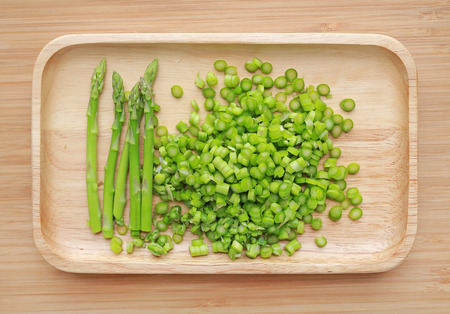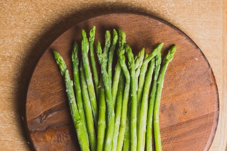 Frozen sticks of asparagus on rustic wood background. horizontal view