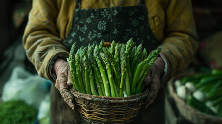 farmer holding a bunch of green asparagus and a basket of peas in their pods generative ai