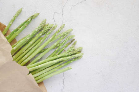 Fresh green bundle of asparagus on a white textured table, vegetables in spring, gourmet cuisine food, cooking a vegan meal