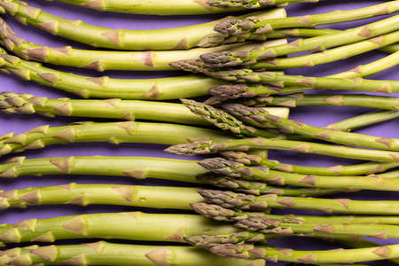 Full frame shot of raw green asparagus vegetables against purple background. unaltered, food, healthy eating and organic concept.