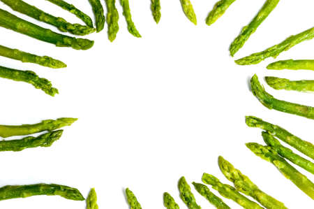 Green fresh German asparagus on a white background, lying in a circle, top view, copy space, text space