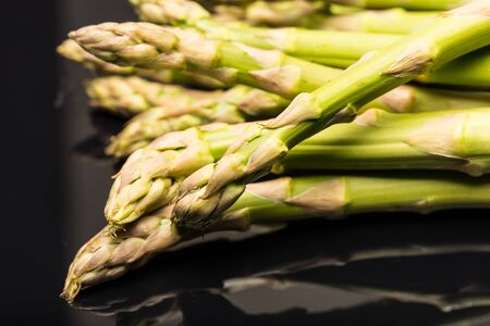 Stems of fresh green asparagus on a black background with place for text. Seasonal spring harvest. Flat lay, copy space. Healthy food concept. close-up