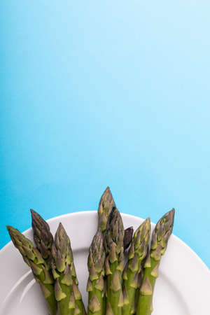 Overhead view of raw asparagus in white plate by copy space over blue background. unaltered, food, healthy eating and organic concept.