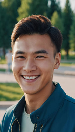 A young man 25 years old with a bright smile stands outdoors, surrounded by lively activity. A resident of Kazakhstan, cute man of 25 years old. A grown man, confident in his abilities. AI generated.