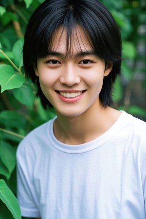 Portrait of handsome asian man looking at camera in the garden
