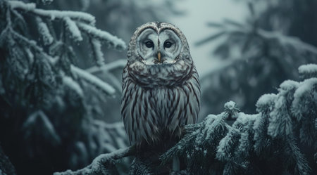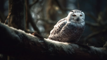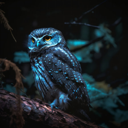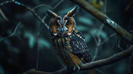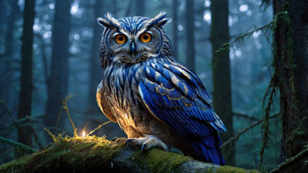Majestic Owl Perched in the Twilight, Showcasing Beautiful Feathers and Intense Gaze, Symbol of Wisdom and Mystery in Nature's Nighttime Scene