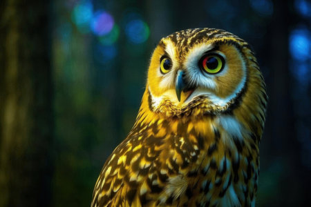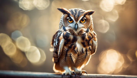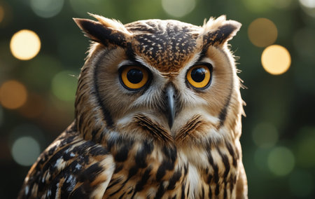 The penetrating gaze of an owl is beautifully juxtaposed with a field of sparkling bokeh lights in the background.