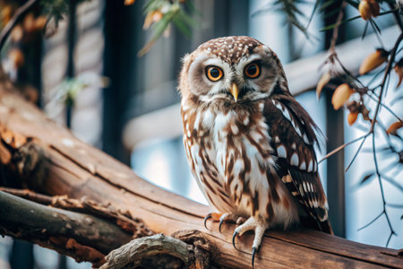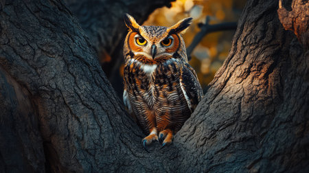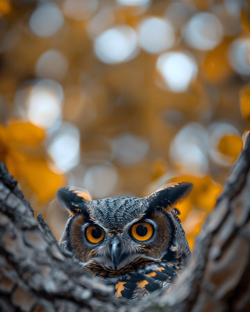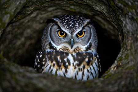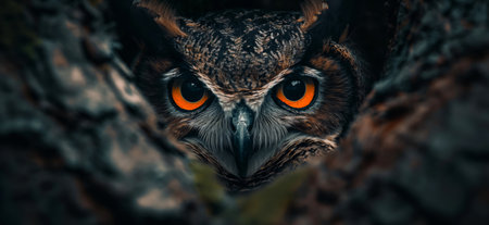 Close-up of an owl peering from its tree hollow nest, its bright yellow eyes captivating and intense