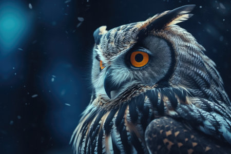 A stunning close-up of a majestic owl in flight over a snowy landscape at night, showcasing its intricate feathers and piercing eyes, capturing the essence of wildlife.