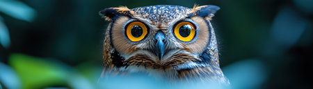 Close-up illustration of a bright yellow big-eyed owl's face on a tree. Owls can convey wisdom, knowledge, intelligence, mystery, black magic, nature, forests, wildlife with space in image for text.
