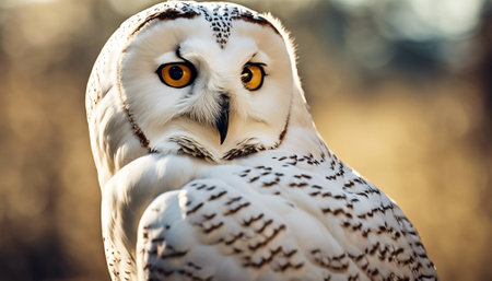 Close up of owl with orange eyes and black and white beak. Generative AI.