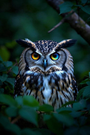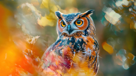 Abstract owl portrait with vivid colors and double exposure effects, creating a striking blend of wildlife and modern art.