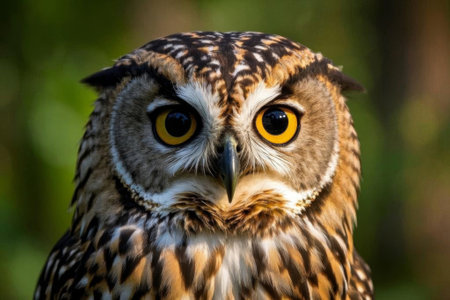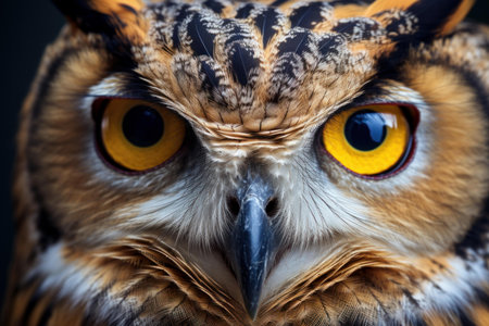 Close up of a beautiful owl with yellow eyes. Portrait of an owl.
