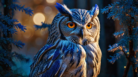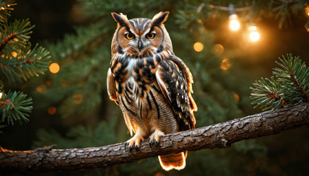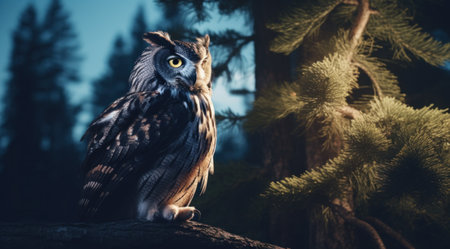 Majestic great horned owl peering intensely from the dark night, framed by pine branches