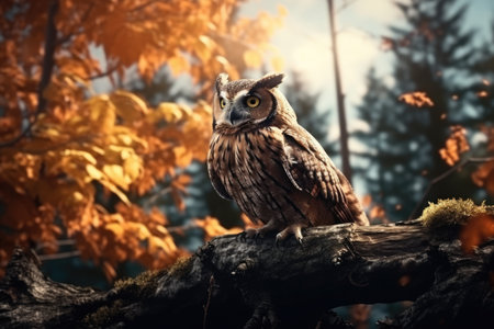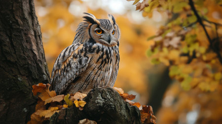 An intriguing owl sits on a tree trunk surrounded by vibrant autumn leaves, showing its distinctive features and keen gaze in a tranquil forest environment.