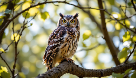 Majestic Owl Perched on Tree Branch Surrounded by Green Foliage in Soft Focus Natural Environment