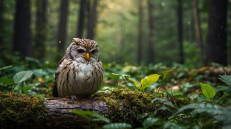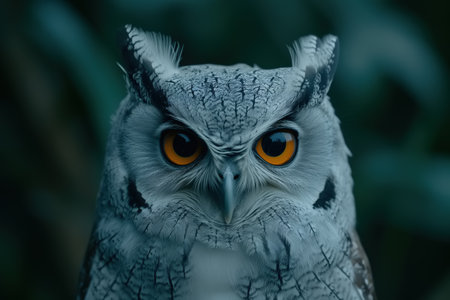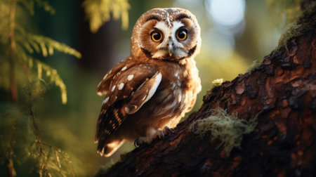 Owl at dusk in forest, wild bird of prey close-up looking at camera in nature.