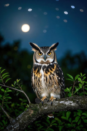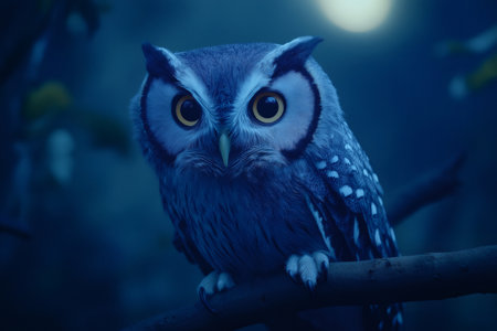 Owl perched on a branch in the night with big yellow eyes and a serious expression, illuminated by the soft glow of the moon