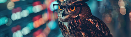 A wise owl with glasses perusing Bitcoin data symbolizing knowledge in cryptocurrency investments