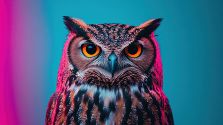 Majestic owl with striking orange eyes, vividly lit in purple hues.