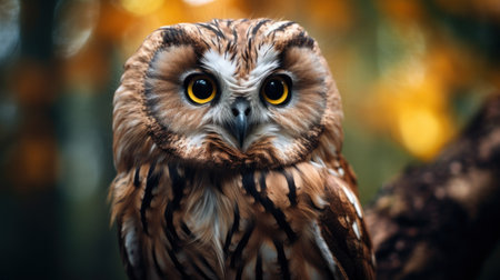 Close-up view of an owl on tree in Autumn woods with beautiful foliage. AI generated.