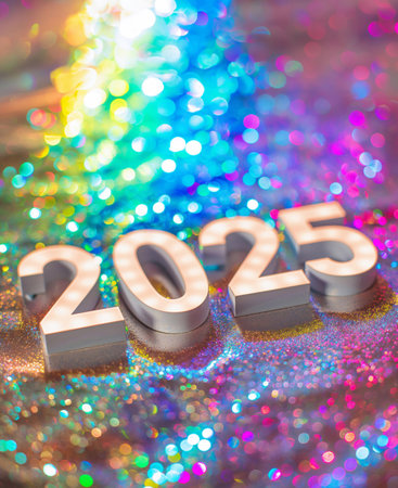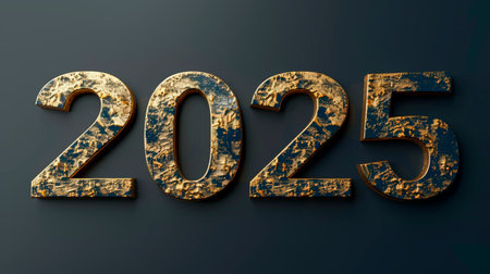 The year 2025 is prominently displayed in large, textured numbers, featuring a golden finish that contrasts against a dark background, showing artistic design elements.