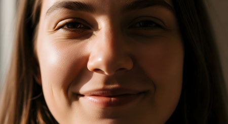 A close-up portrait of a young woman with a genuine smile, her face illuminated by natural sunlight that casts soft shadows. The image captures authentic beauty, happiness, and positive emotion.