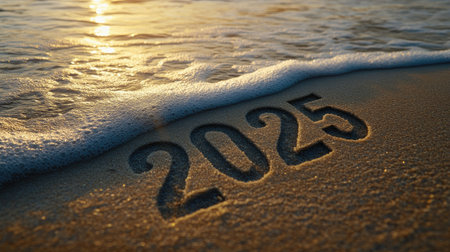 A serene beach scene featuring the year 2025 imprinted in fine sand, gently washed by ocean waves at sunset. Perfect for conveying a sense of time and tranquility.