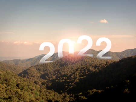 Happy New year 2022 with large letters on the lush green fertile mountains and blue sky, beautiful view with copy space, a successful concept. Welcome, Merry Christmas, and Happy New Year in 2022.