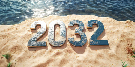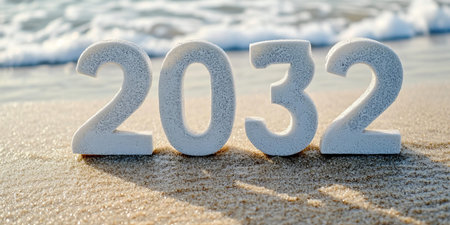 Serene Coastal Beach Scene with Sandy Shore and Numerals Displaying Future Aspirations for 2032