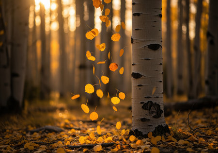 Vibrant yellow and orange autumn leaves descend gracefully around a tall white bark aspen tree in a sun drenched forest, creating a serene fall scene.