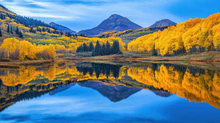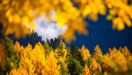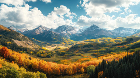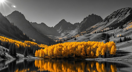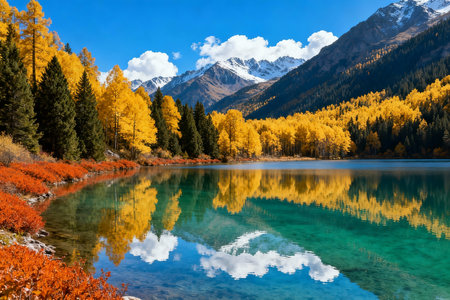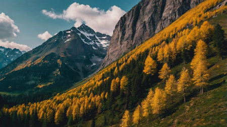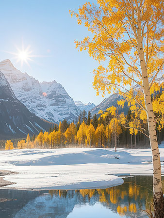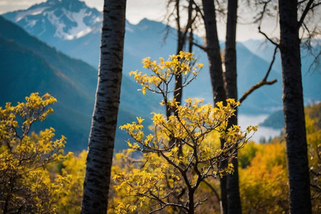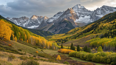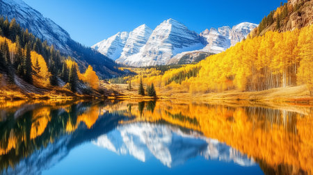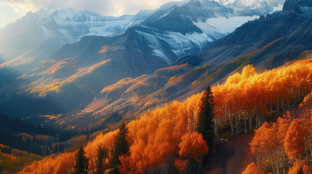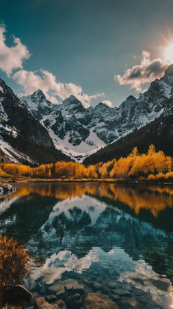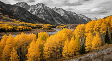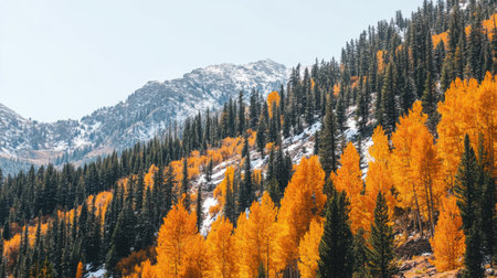 Stunning autumn scene showcases golden foliage amidst snow-capped mountains, capturing the beauty of nature's seasonal change in a tranquil environment.