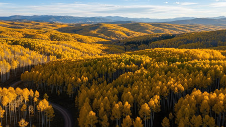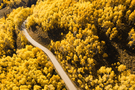 Beautiful dirt road winding through yellow aspen forest during golden sunset in peak fall foliage at Crested Butte, Colorado, USA. Aerial view of scenic autumn season mountain landscape