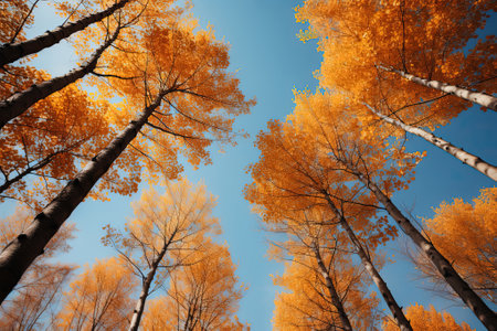 Trees in autumn park from below, yellow tops of trees, blue sky background. Generative AI
