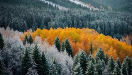 Colorful autumn forest in the mountains. Beautiful winter landscape with trees.