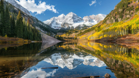 Panoramic image of Maroon Bells mountain peaks reflecting in Maroon Lake on early autumn morning with bright blue skies and changing yellow Aspen trees on mountain slopes