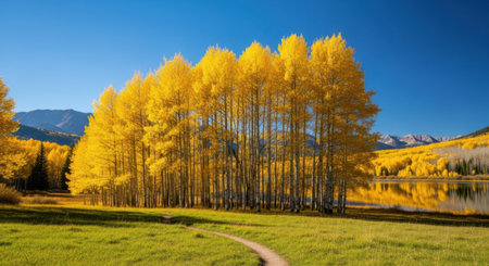 Golden aspens line the shores of a serene lake, reflecting the jagged peaks of the Rocky Mountains. Nature's palette shines brightly under a clear blue sky in this peaceful autumn setting.