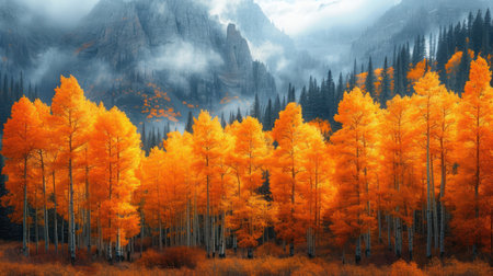 Colorful aspen trees in the autumn forest with mountains in the background
