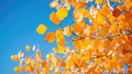 Yellow foliage on blue background. Autumn.