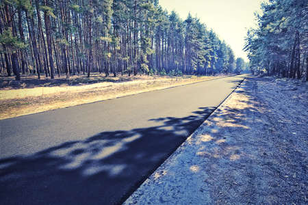 Old abandoned asphalt road in the autumn pine forest. Mystery autumn forest landscape. Beauty in nature. Selective focus